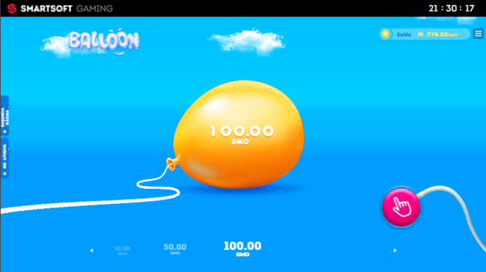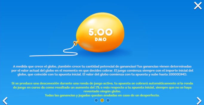 Balloon acepta apuestas mínimas de 0.10 y máximas de 100 DMO, y cada ronda puede alcanzar un valor máximo de hasta 10.000 veces la apuesta inicial, siempre en función del momento en que el jugador decide retirarse antes de que finalice la ronda.